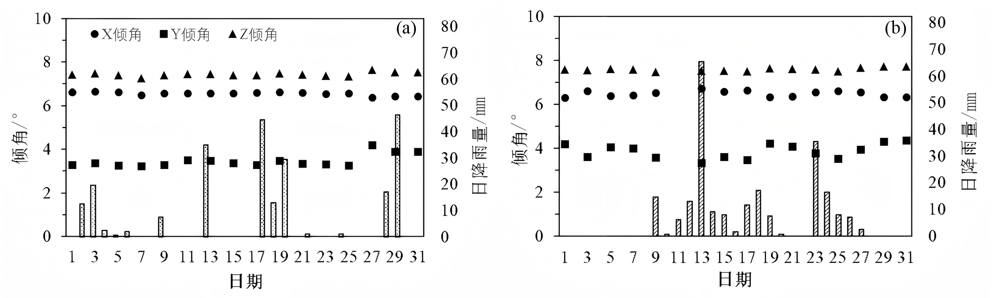 图82021年7月(a)至8月(b)滑坡倾角与降雨量关系图