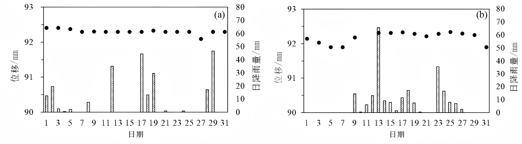 图92021年7月(a)至8月(b)滑坡位移与降雨量关系图
