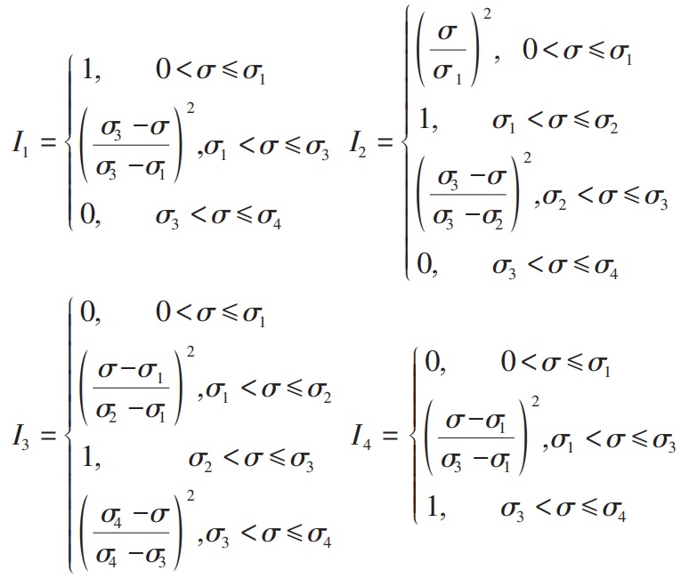 式(8)中,I1,I2,I3,I4分别代表被评价对象的低、中、高、极高易发等级隶属度;σ 为被评价对象实测值;σ1,σ2,σ3,σ4分别代表评价对象的界限值。