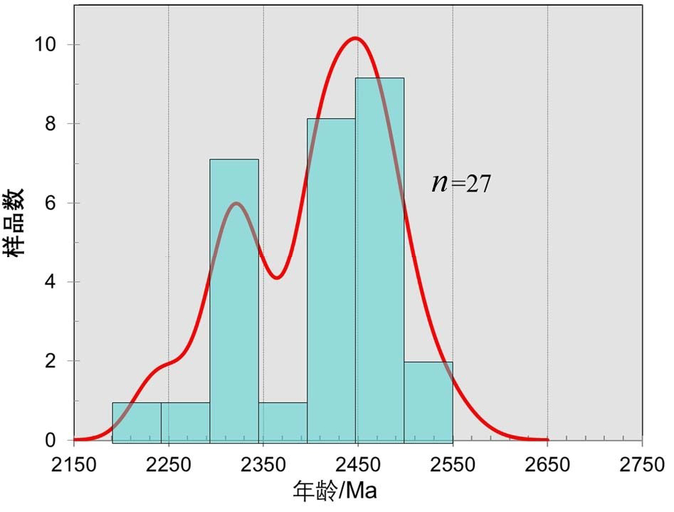 从测试获得的锆石年龄来看,测点的年龄值为 2232~2800 Ma。经过观察,除去点 1(2257 Ma)、点 16(2232 Ma)、点 28(2800 Ma)零散分布外,其余年龄集中分布在 2307~2542 Ma,并且有两个年龄峰值 (图5)。通过对剩余 27个点进行分组处理,并在作图过程中去掉rho值大于1的点(点12、点14、点23、点 27),给出了(2453±21) Ma 和(2323±21) Ma 两组207Pb/206Pb加权平均年龄(图6)。