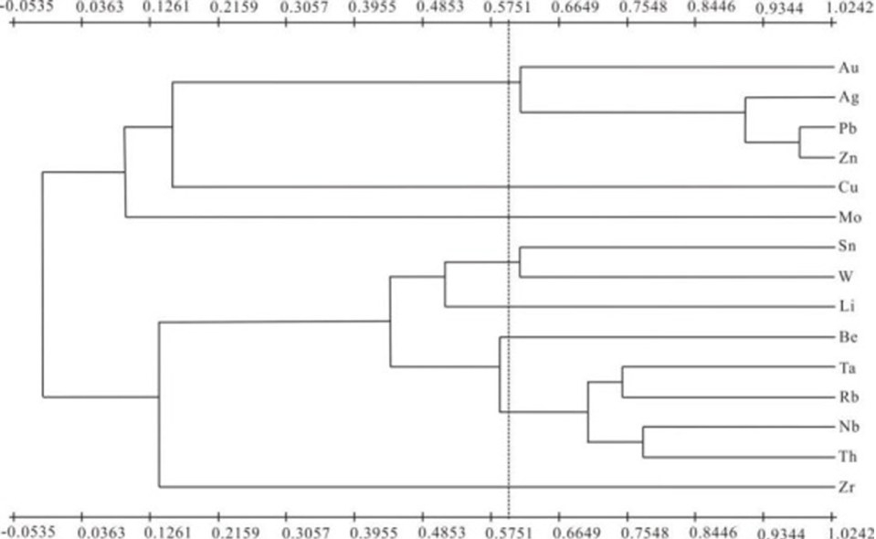 为了解元素的共生组合规律,对区内15种元素进行了R型聚类分析,根据R型聚类分析结果,在相关系数为 0.59 时,Pb-Zn-Ag-Au、Li-W-Sn、Th-Nb-Rb-Ta-Be 共 3 种组合。Mo 和其他元素相关性较差,呈独立状态(图2)。全区既有高温元素组合,又有中低温元素组合,说明本区地质作用复杂,经历多期地质改造作用,反映了该区构造极其发育,热液活动频繁。