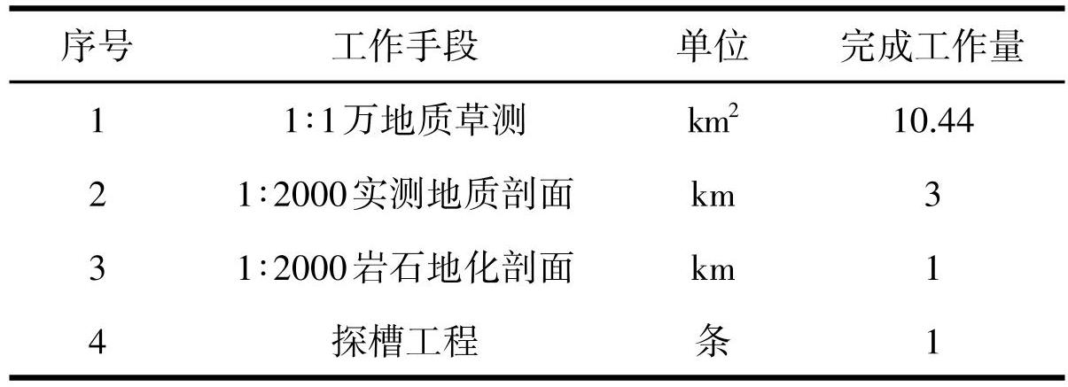 异常查证工作方法主要为大比例尺(1∶10000) 地质草测、地质、地化剖面测量和槽探工程揭露等,完成主要实物工作量见表6。
