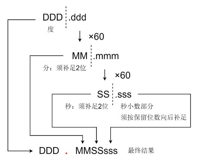 式(1)中,D10为十进制度,DDD为度整数部分, MM为分整数部分,SS.ss为秒部分。