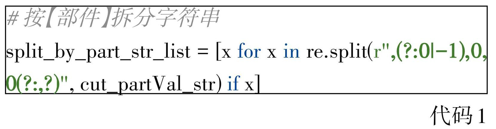 输入参数即为矿业权核实坐标字符串,截取字符串第一个逗号后半部分(cut_partVal_str),使用代码1,将其分割为部件列表,其中re为Python正则对象。