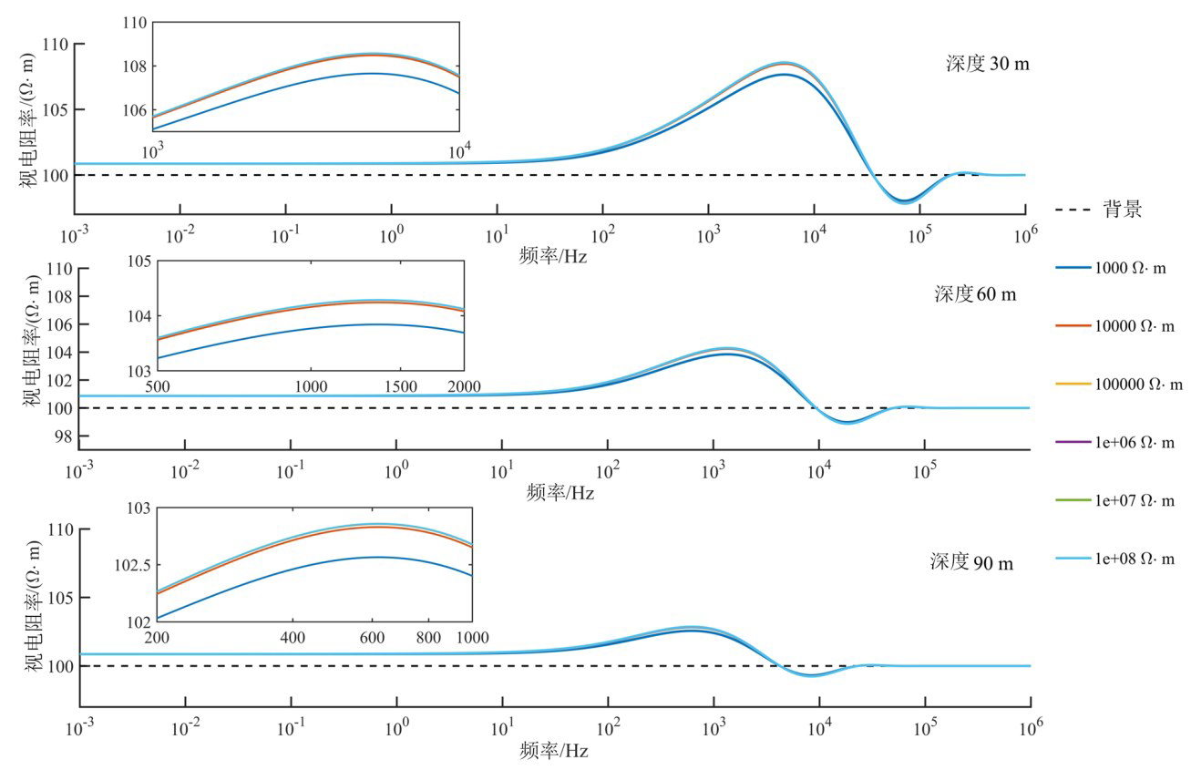 针对电阻率为 108 Ω·m 的空气采空区,图8展示了其在 30~130 m 埋深范围内的视电阻率曲线。可以看出,对于固定埋深,在低频阶段,视电阻率值接近背景电阻率。随频率升高,目标体影响显著,视电阻率呈现峰值异常。频率进一步增加,视电阻率值恢复至背景电阻率。这是因为当频率过高或者过低时,高频电磁波主要受背景电阻率影响,对采空区异常不敏感。通过比较不同的埋深条件,可知随着目标体1埋深变浅,视电阻率峰值幅值增大,相应峰值对应的频率增加。