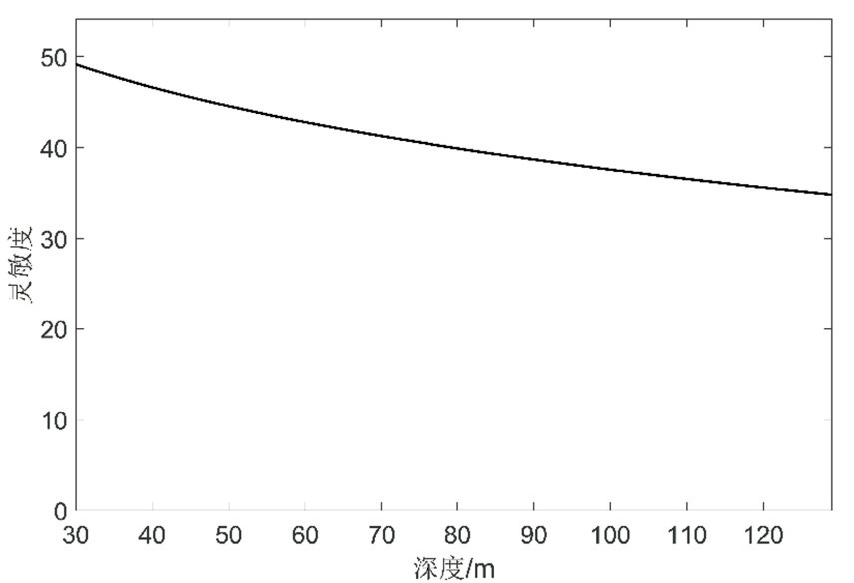 采用灵敏度公式(4)进行处理分析,电阻率为 0.01 Ω·m的富水采空区灵敏度随深度的变化如图3所示。可以看出,当埋深较小时,灵敏度值最大,接近 50。随着埋深增加,灵敏度值逐渐减小,但是仍然大于35。这说明,富水采空区在采厚比30~130范围内均能够被有效探测到,埋深越浅,异常越显著,更易探测。