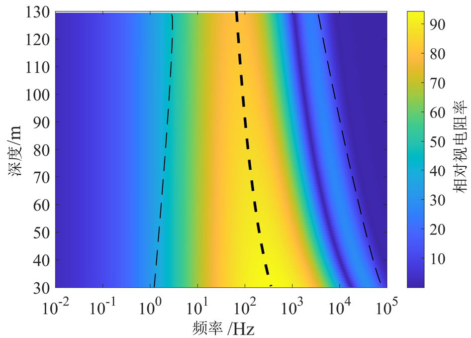 在电磁探测研究中,一维图通常表现单一变量 (如频率或深度)与视电阻率的线性关系,难以全面呈现多参数耦合作用下的异常响应特征。相比之下,二维图通过横纵坐标系统集成双变量分析,可清晰揭示目标体埋深与频率之间规律。针对富水采空区这一典型地球物理场景,目标体设定为电阻率 0.01 Ω·m、厚度 1 m。如图6所示,通过频率与埋深的耦合关系,直观展示了富水采空区在多参数影响下的异常响应,并给出埋深一定时对应的最优频率。
