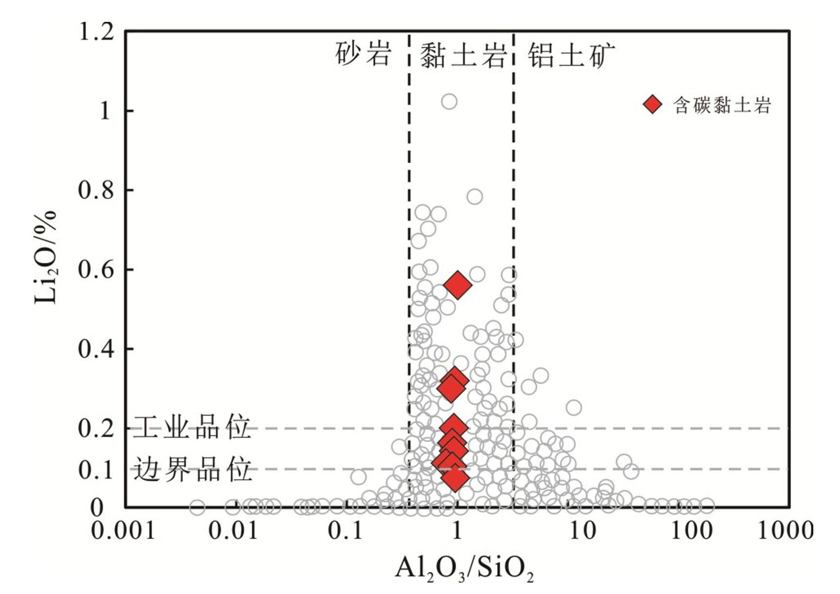 值得注意的是,本研究是在已知前期槽探工程 Li2O 含量基础上进行采样,但分析结果得到的 Li2O 含量存在一定差异(表2),其中 22-JTC1-2、22-JBT1-1、22-JTC9等样品Li2O(0.07%~0.16%)含量明显低于前期槽探结果,而22-JTC2样品Li2O(0.56%) 含量则高于前期槽探结果,反映出含炭黏土岩中锂富集现象的不均一性。在 Li2O-(Al2O3/SiO2)图(图7)上来看,本次含炭黏土岩样品Al2O3/SiO2比值集中在 1 附近的黏土岩阶段,这也指示着适中的风化程度有利于锂的富集(温汉捷等,2020;凌坤跃等, 2021)。