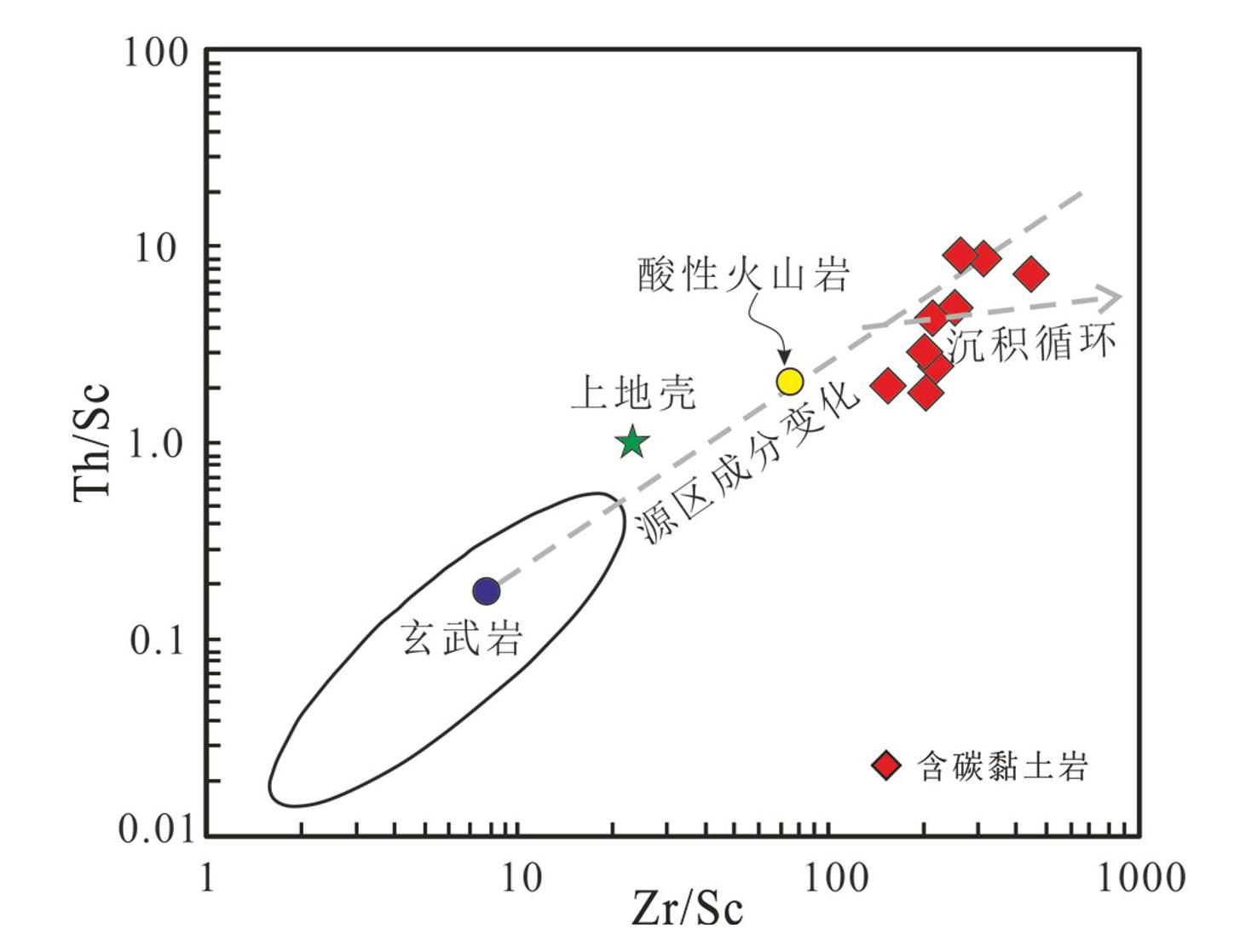 图10白杨坪地区黏土岩Th/Sc-Zr/Sc图解