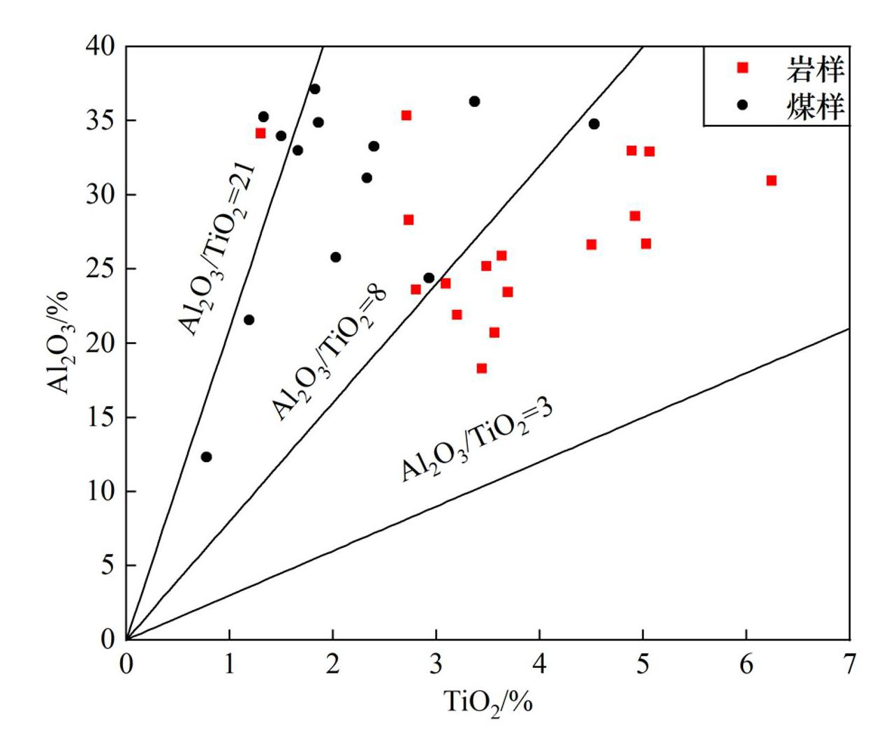 由图7可知:煤样中 Al2O3/TiO2 比值 7.68~2 6.51,平均 16.28,多落入中性岩区域(个别为酸性或基性),这与 Dai et al(.2015a)的研究成果较为一致,其认为古叙矿区C25煤中无机质的来源为峨眉山玄武岩序列上部的酸性—中性岩;岩样中Al2O3/TiO2 比值 4.96~26.28,平均 8.23,多落入基性岩区域(少数为中性或酸性)。由此可见,研究区含煤岩系物源以中性岩—基性岩为主,含少量酸性岩。