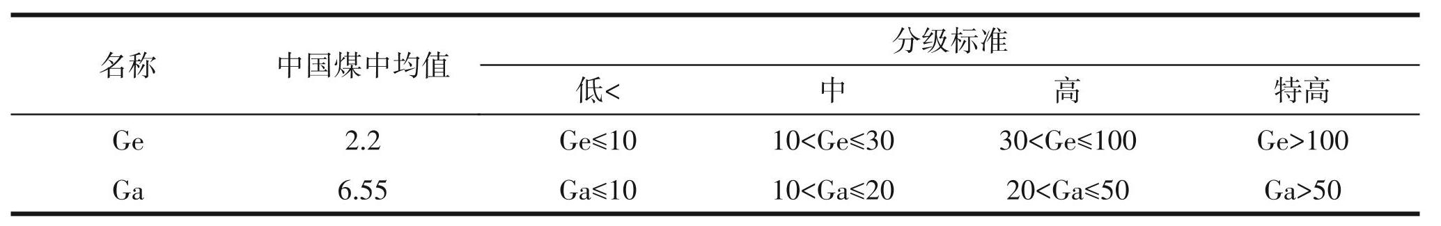 表4中国煤中Ge、Ga平均值及含量分级标准(μg/g)
