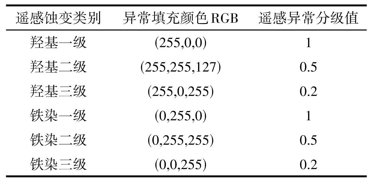 对于遥感异常,不同波段波谱特征为不同程度的吸收特征,矿化蚀变多伴生有绿泥化、绢云母化、高岭土化等,这些蚀变矿物大多含有羟基(OH-),碳酸盐化矿物如方解石、白云石、菱锰矿等矿物大多含有CO32- 基团。依据蚀变矿物的波谱特征,对ETM 图像的 B(1、4、5、7)波段和 B(1、3、4、5)波段进行主成份分析(PCA),分别提取相应羟基和铁染蚀变信息。遥感异常分级所采用的不同阈值对应不同图像,以±5σ(标准离差)为主分量输出的动态范围,获得蚀变遥感异常主分量,遥感异常的表示色块以及异常分级值见表1。