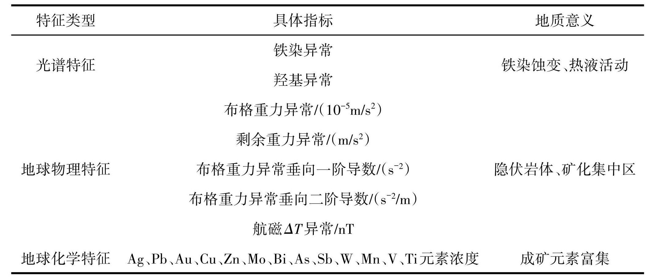 根据研究区内开展的1∶5万水系沉积物测量成果(卢文东,2019),确定一处面积约34 km2 的综合地球化学异常,形态近椭圆,轴向东西,以 Ag、Pb、Au、 Cu 为核心元素,伴生 Zn、Mo 等多种指示元素,各元素异常套合紧密,Ag峰值高达4871.00×10-9,其他元素亦高浓度。异常紧密围绕穹状火山机构,与已知金矿、银矿及铅锌矿位置吻合,预示广阔找矿前景。目前发现多处高品位 Au、Ag、Cu、Pb、Zn 矿体,主要围绕杂岩体构造带成矿,具“矿致异常”基本特征,因此选取所有 13 种元素异常剖析数据作为重要预测因素,以供深度学习预测模型学习。