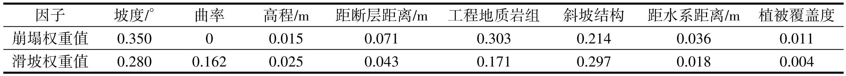 表3崩塌、滑坡易发性评价因子权重值
